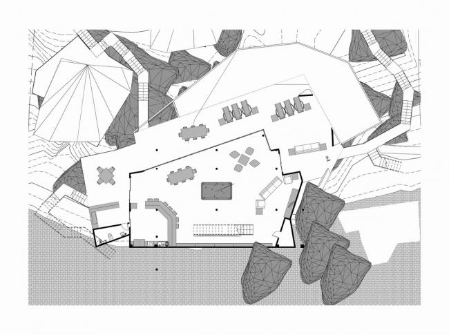 设计师的主要想法是要创建一个建筑和周边环境的反差对比。于是我们看到有着尖锐转角的白色的建筑体块依附山势,坐落在那些圆滚滚的黑灰色岩石上。