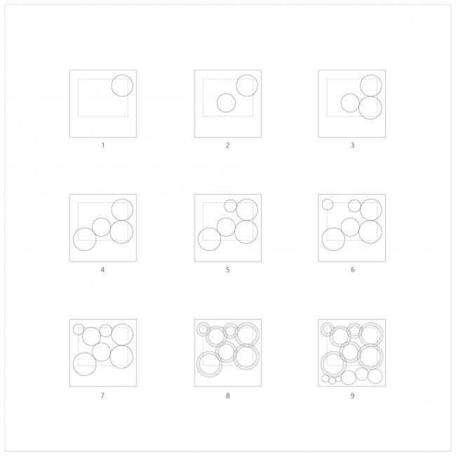 建筑外表的不规则板片划分,由每一个圆形按照同样规则沿切线发散交织而成。