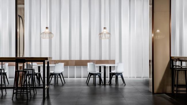 餐厅部分,我们拉长了远端的墙面,让它形成欢迎的态势,使整个建筑显得既有节奏,又不失统一性,分流明确。