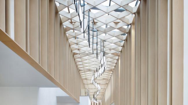 交互中庭完成后,整体是一个玻璃顶的阳光房空间。阳光虽然很好,但由于鞍山的空气质量也不是很好,所以四季的灰尘也是比较多,而且大部分时间阳光是一种直晒的形式,温度的控制和人们的舒适感并不是很好。我们运用交叉的X型造型,制作了整个空间的格栅系统。