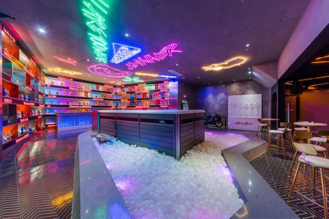 室内游泳区设计为空间当中最大的亮点之一—无边泳池系统。泳池周围以海洋球进行装点,LED柔光霓虹灯、栅格状不锈钢酒架的设计,不锈钢反射光影,光线穿透酒瓶,泳池party和光影横竖变化让整个空间氛围达到极致。