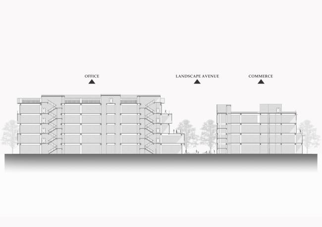 作为办(BIM建筑)公区的配套,商业区的建筑考量也从增加立体空间的变化、实现人们在各层对户外空间需求的角度出发,设计了丰富的半户外空间和露台花园。建筑围合出的广场景观和露台景观相呼应,形成特色的共享开放空间。