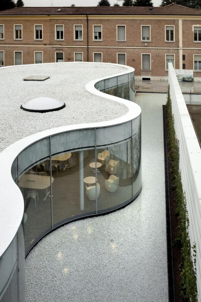 项目地点在摩德纳马拉内罗VittorioVeneto街道,这是一个发展良好的住宅网络。建筑外墙北侧跟住宅庭院相接,西侧是公共空间,南侧部分依附于住宅楼,东侧是另一个部分倚靠的住宅楼。设计项目表面积为1175平米。这是一个现有建筑改造项目,北围墙修护,东侧和南侧受办公楼和住宅限制,原先的中央部分拆除,在原体量中置(BIM工程师)入图书馆,高度保持和旧楼一致,外部向外并向下发展。新图书馆入口被设置在西侧。