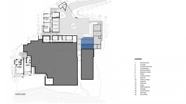 一个巨大的棕榈树环绕的入口庭院在宾客到来时营造出一种舞台场景的效果,巨大的楼梯漂浮在瀑布之上。由整块石材覆盖的墙壁在宾客进入住宅时提供了独特的体验。中央的入口可以作为抵达住宅时的聚集区。休(BIM建筑)息室、餐厅和非露天式的露台形成了住宅的核心,由内而外进行辐射,使得用于栽种植被的庭院和景观互相呼应,与西边的广阔庭院形成了对比。