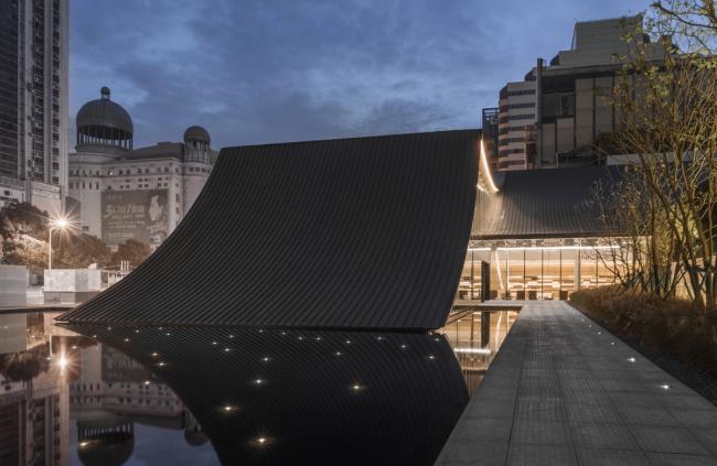 设计师重新思考了内外空间的关系与秩序,通过屋面与玻璃幕墙、室内吊顶之间过渡的交接细部构造设计,突显檐口的薄与轻盈,以极致细节造就由内而外、由外及内的空间渗透体验。定制的屋面排水系统使屋顶呈现出干净的柔美曲线。