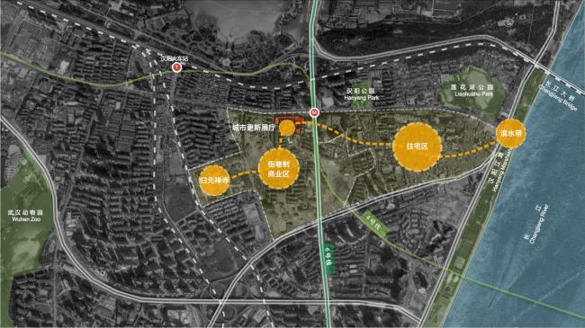 归元禅寺东部是远洋集团的城市更新板块,作为大型的旧城改造片区,这里一度充斥着颇具时代烙印的万象建筑群、零星分布的交通站点、鳞次栉比的高楼以及亟待拆除的旧宅。时至今日,住宅和商业地块的改造正在有序进行,并由西向东打造了“归元禅寺——街巷制商业区——城市更新展厅——住宅区——滨水带”的城市通道,将百年古刹的焚香古意和城市更新的坪野风物赓续绵延至长江一带。