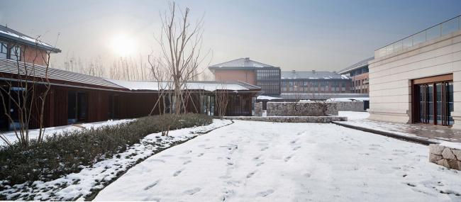总平面布局上,书院中心围合出了大小不同、动静相宜的四个内部庭院,通过起承转合的连廊,组合形成了丰富的室外空间,从而融各种行为方式与场景的戏剧化于一体。精细的砌筑、自然的色调,使最终建成的清水砖或红砖表皮呈现了生动的表情;青绿的草坪,红色的砖饰以及浅色的砂岩,温和而不失雅致,有时间的沉淀也有现代建构技术信息的传递。