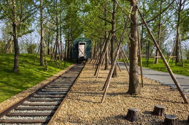沙河源公园,位于大西南建材城旧址,大量遗留的铁轨及存储木材的厂房被作为设计要素加以提炼。同时场地由府河、沙河环抱形成双河环抱、四面环水的河心岛形态,水质优良,植被茂密。这里也位于锦江绿道规划带中,沙河源公园的建立,形成了全新的、连续的城市绿廊。