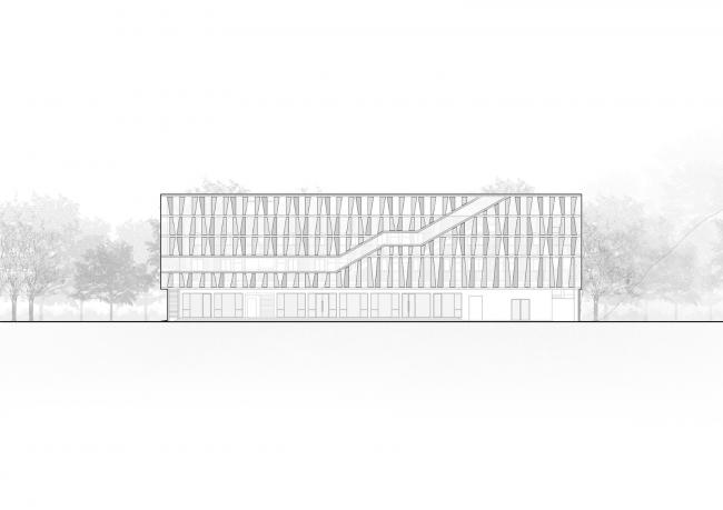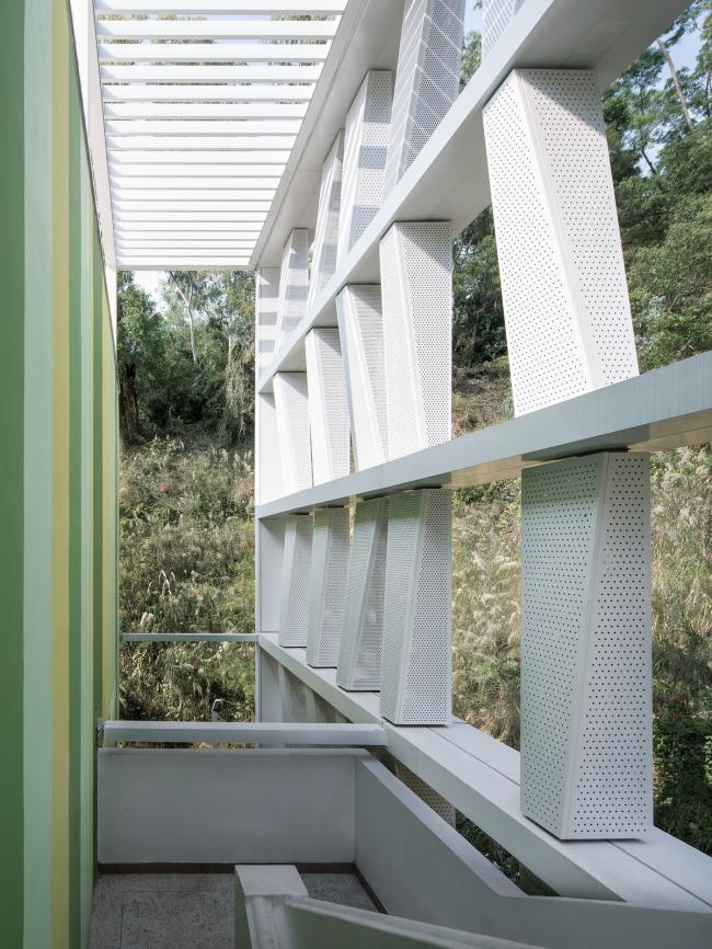 另一方面,原有的二层和三层的瓷砖墙翻新成涂料墙,四种绿色形成的丰富条形图案与周边的绿树相得益彰。而白色的幕墙立面让建筑保持谦逊的姿态的同时,内侧的绿色外墙透过幕墙若隐若现。正面观看建筑时,绿色内墙最大限度呈现出来,建筑表现内敛的绿色外观。随着观看角度变斜,立体的梯形体逐渐遮挡更多的绿色内墙,建筑的绿色外观变得灵动,而不是呆板直白的形式。另外,原有建筑的二层室外平台比三层室外平台要宽,新加的幕墙表皮与原有建筑外墙之间便形成了一个室外的围合空间,成为积极的室外交流场所。