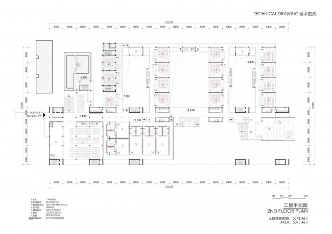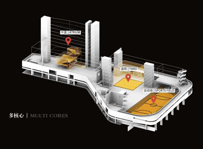 文化骑楼的设置在垂直方向上将校园分成了两个部分:城市共享区与校园核心生活区。这种上下分层的结构使共享区域具备了一定的独立性,方便学校的管理,避免了校园城市共享带来的安全问题。城市共享区位于校园底层,包含食堂、球场、报告厅等功能,周末可对社区开放。校内的各功能用房则聚集在中庭、庭院、运动场等核心空间周围,为师生提供更多的交流机会。2-5层为教学区,其中2-4层主要容纳普通教室,每层两个年级(共14个班),音乐、计算机等公共教学用房主要分布在5层。位于屋顶花园之上的塔楼部分则集中布置了行政办公和教室宿舍,充分改善了教师的办公住宿条件。自此在基本保留了原校舍功能布局的基础上,整个校园形成了多核心多平台的空间格局。
