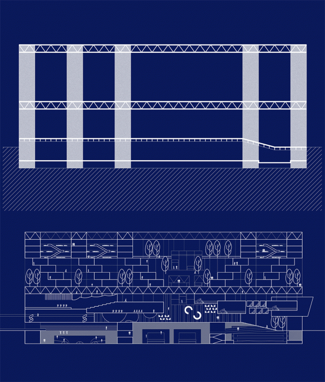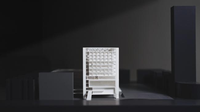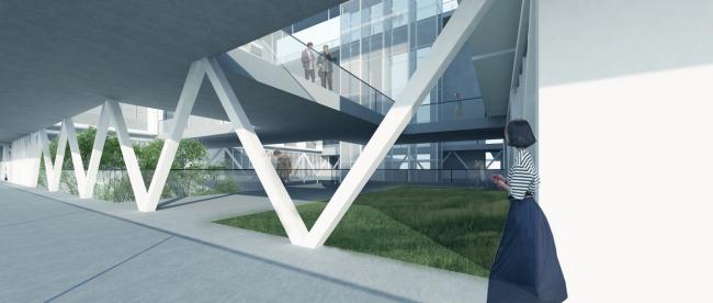 综合大楼采用巨型悬挂结构体系,既解放了局部的建筑空间,满足多变的层高和大面积无柱空间要求,又为建筑在将来的改造和升级预留了充分的可能性。巨型结构在满足建筑结构的不同工况的同时,也表现了一个开放透明的未来生活学习方式的空间范本。我们将这座综合大楼理解为一个高密度城市背景下未来校园的模型,暴露建筑主要承重结构,强调构件交汇处的构造方式,并将桁架作为建筑室内空间表现的元素,表现结构构造和机器美学。