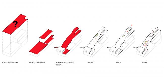 首先,我们通过对原有内部空间以及外立面简单清理的基础上,保证原有建筑内部烘米功能正常使用。其次将一张连续的表皮包裹在原有建筑外侧,通过楼梯以及大的观演平台将地面的人流引导至屋顶之上。在提供活动空间的同时,也提供了一个观看四周城市为背景的农田景观的平台。