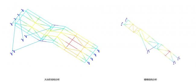 为了达到公共活动楼梯平台以一个轻盈的姿态和原有建筑对话的效果,结构设计时在考虑了原有结构牢固度以及乡村建造技术的局限性以及施工便利度的前提下,最终选择了人字型钢结构支撑体系成为最后选择的结构方案:以两组V形支撑两组连续面,达到了轻盈的支撑的漂浮效果。