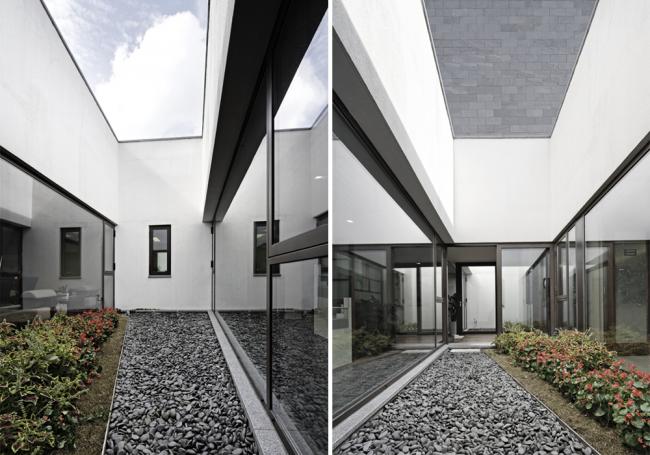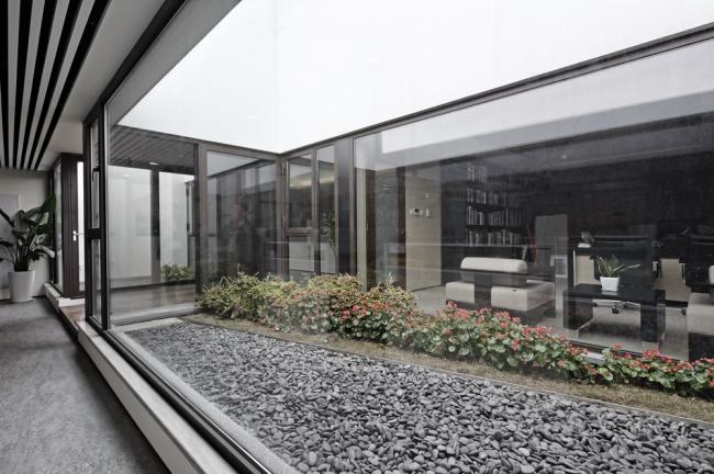 首先,根据空间的整体布局,在800多平方的面积里留出了4个天井内院,使人无论走到哪一个空间都会看到天井。除了可以增加自然采光、通风的比例,还可以有些户外活动,也使空间增加了灵动的趣味,在院落窗前感知阴、晴、雨、露,更不同于仅仅是竖向的玻璃幕墙。通过天井的分隔,营造了类似于中国传统建筑“庭院深深深几许”的院落意向。预留的构造梁并不是很高,梁底仅有2700mm,完成吊顶、地面铺装后将会显得很低。