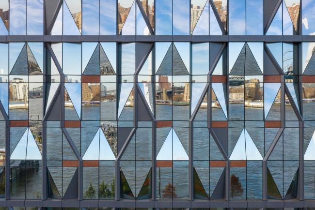 ODA 研究了原建筑的历史后,以糖晶体、破碎的晶洞、结晶表面为灵感绘制了一系列概念图,如今,这些元素组成了该建筑的反光外立面,映射出公园和日落河景。该建筑的翻新包括了对建筑东北南三面的原始墙,以及建筑内部的砖砌拱顶和柱子,都按照原样进行修复。建筑内部空间为动态办公提供了开放式的楼面,也将曼哈顿和威廉斯堡河岸的开阔景象拉入眼前。拱顶和外露的砖块,与全层高的玻璃幕墙相交。