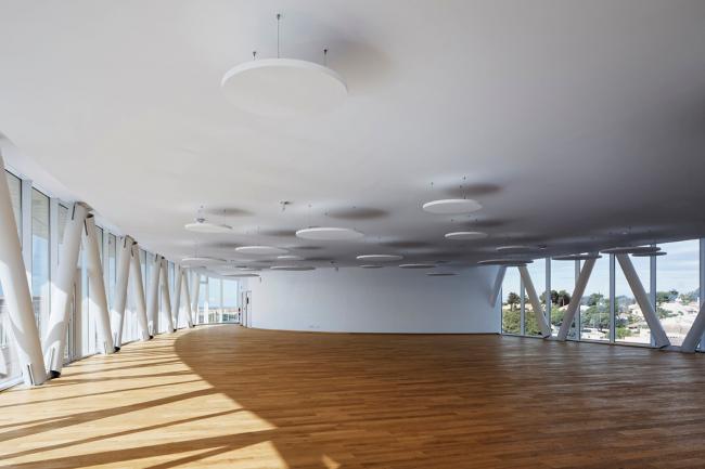 展览馆大厅分为三层,这三层都连接着总舵蜿蜒走道的其中一条。 一个非常有趣的空间组织让室内外空间可以自由的进出,通过步行或自行车轻松访问诸如大堂,展览厅,办公室,会议室和能容纳1200人的礼堂等所有服务设施,其中礼堂内布置绿松石蓝座椅,在这白色综合体中的唯一强调色勾起了人们对地中海波浪的印象。