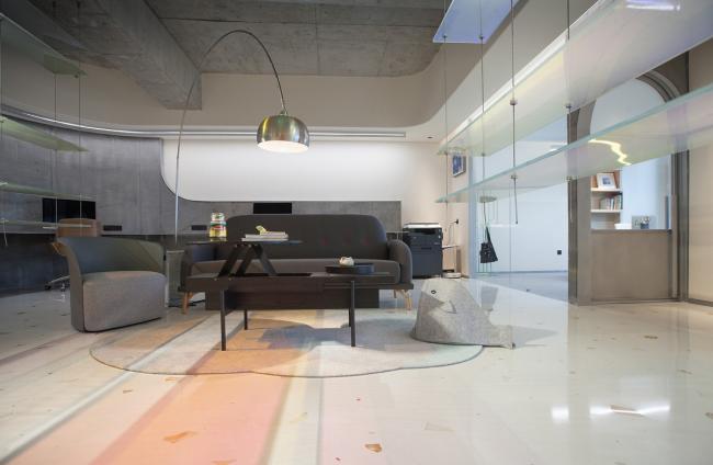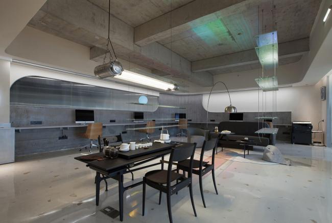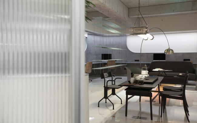 休憩区临近弧形工作台,通过悬挂的玻璃层板分隔。没有明确的界线来划分工作与休闲,正如我们所希望的,一切情绪与需求来自于自身的判断和坚持。