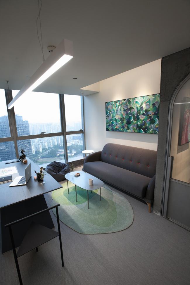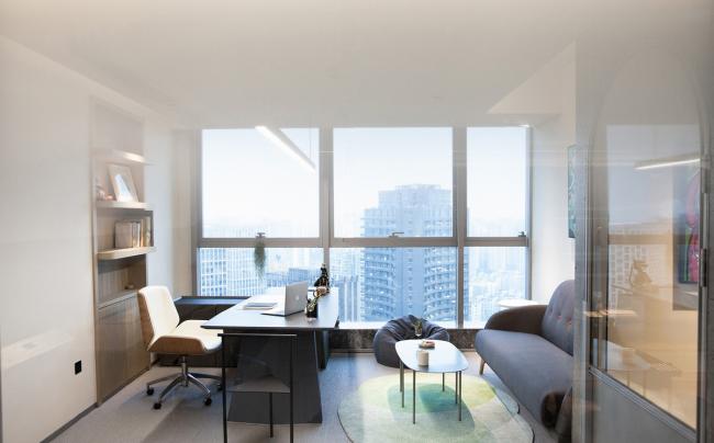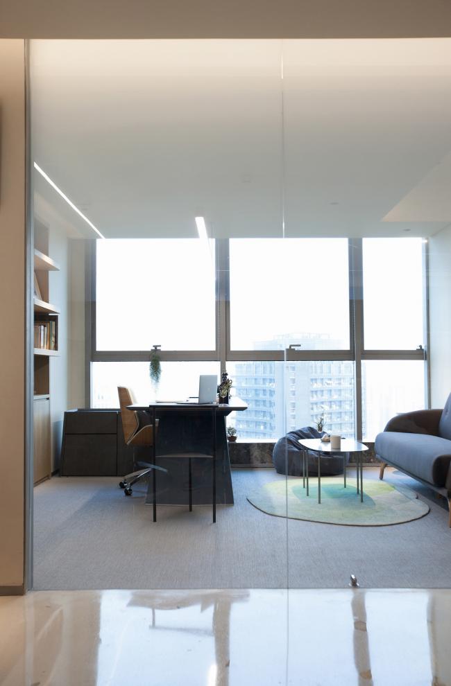 独立办公空间延续主思路的自由感,散而有序。两间办公室基本呈镜像相对,为保留通透的自然光照,采用了渐变玻璃隔断与公共工作区域分隔开来。