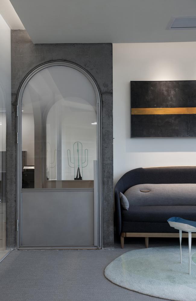会议室被设计成一个可全封闭的盒状空间,满足私密安静的会议需求。同时明亮的浅色系和弧形门窗为原本闭塞的空间注入活力和呼吸感。