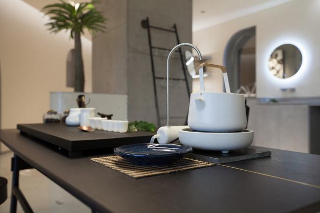 公共区域设有满足小型会客需求的饮茶区。极重的硬朗灯具搭配极简家具,形成鲜明强烈的对比。