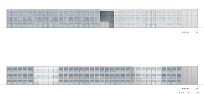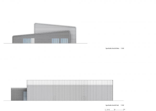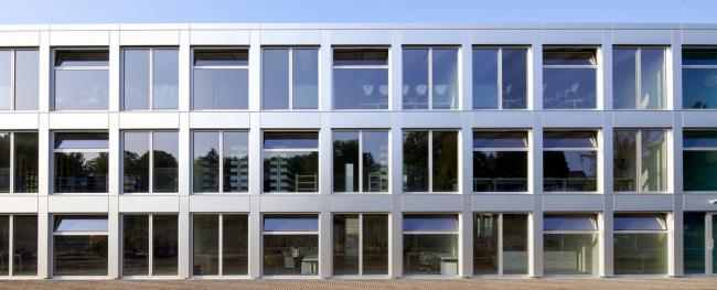 学校建筑为南北方向,修长的折线结构,教室外墙大多为东西朝向,行政和专科教室分别安排在朝北和朝南的区域。外立面的设计反映了内部空间的使用,所有可用的空间均由垂直或者水平分科的大型玻璃外墙分隔。走廊采用了完全透明的玻璃幕墙,所有的玻璃表面,除了朝北的立面以外全部配备了垂直的遮阳装置,在不透明的外立面覆盖了大型的铝板。屋顶绿化广泛,雨水管道均铺在立面前,使得排查的工作很容易进行。