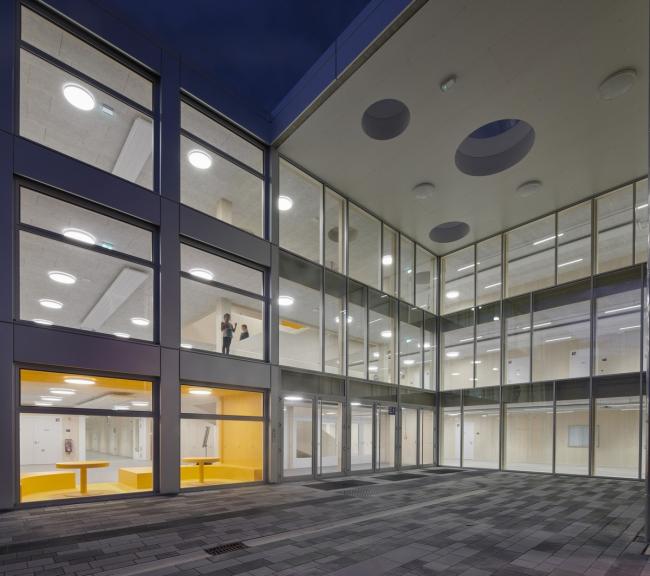 学校建筑通过中央入口区 – 大厅进入。通过大厅的五个楼梯间和一个开放式楼梯可以垂直进入建筑物。学校共有32个不同大小的教室。底楼设有一间可延展的大型多功能厅,相邻的厨房和食品柜台也可作为用餐室。专业的教室,行政房间以及工作和储藏室为学校要求的空间。大厅是学校的心脏,是大家共同聚会场所。所有楼层均位于建筑物中间,连接的方式非常清楚明了。另外五个楼梯间为垂直通道,同时可以帮助大家在需要的时候轻松逃离建筑物。这些楼梯间旁边是必要的辅助和技术室。
