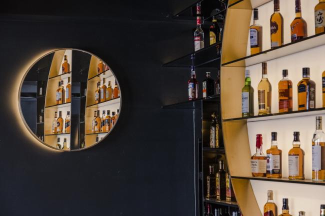 从啤酒酒吧延伸过来的就是威士忌酒吧,几乎占据了整个平台的面积,也因为高(BIM)差,威士忌酒吧的吧台回落到了正常的座位高度。无论是从空间布局还是功能使用的层面看,这个平台都扮演了不容小觑的角色。 吧台后方的酒架同样延续了对于“倾月”的造型解读,如一轮徐徐升起的明月。