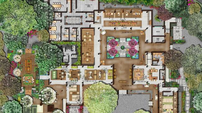事实上所有建筑布局都以院落式布局展开,大堂也并非只是大堂,而是一系列公共活动的场所,围绕典型的川西庭院而成。