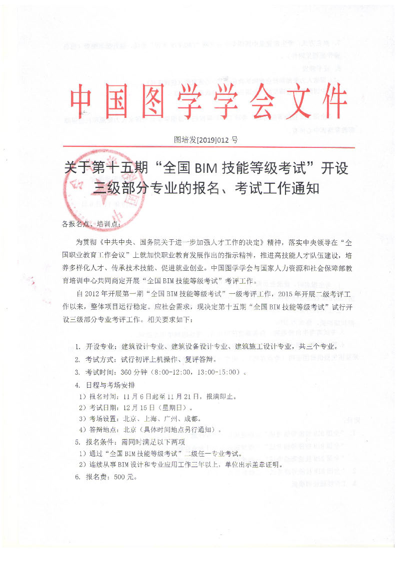 关于第十五期“全国BIM 技能等级考试”增加三级专业报名、考试工作通知