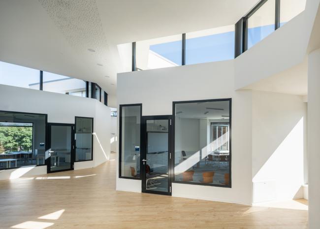 建筑可容纳大约500名学生,他们可被分成不同规模的群体和社团。他们来自三个不同的年龄层,具有完全不同的需求。他们的学习活动空间都被置于圆环上,但是彼此独立。对于最小的孩子,我们在建筑内部创造了一个完全独立的世界。建筑有两个独立入口:一个是幼儿园和小学入口,另一个是高中入口。后者是建筑体的主入口。一个完整的空间被独立出来,供幼儿园和小学单独使用。公共区域、行政办公室、礼堂和餐厅被置于一层,而更安静的二层被保留,用作学习空间。