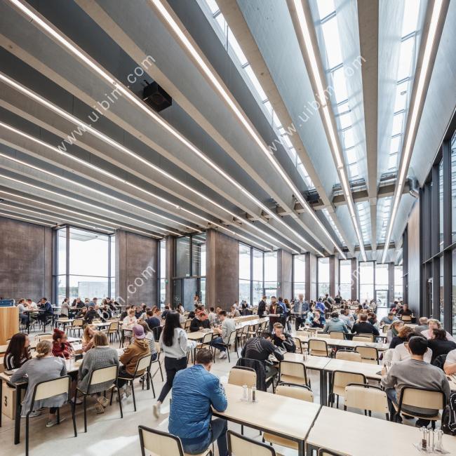 除了空间的自然可持续性外,建筑师还为阿迪达斯总部设计了一个充满活力、善于激发灵感并非同寻常的工作环境,旨在为各类使用者提供充满创意的非正式会面场所。因此,建筑师在大楼内共设置了12个工作坊空间,每一个空间都代表了一个特定的运动场。同时,建筑师还设计了一间可以容纳1500人的大型会议厅,并将其布置为一个带有老式门栏的体育馆场景。此外,建筑师还与丹麦著名的设计品牌HAY合作,为这栋大楼空间定制了一把名为HALFTIME椅的室内坐具。