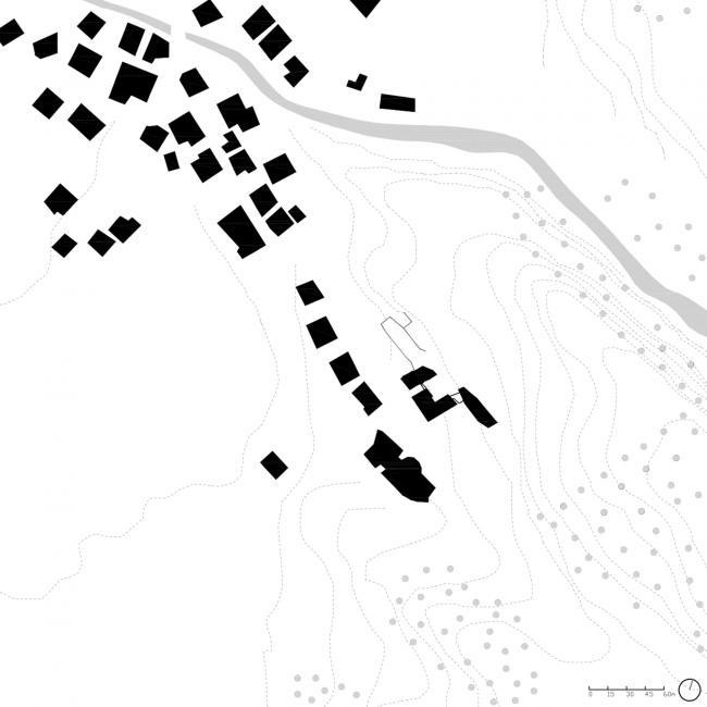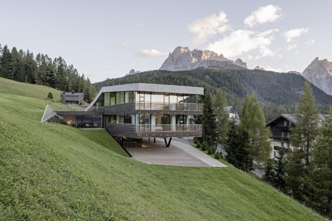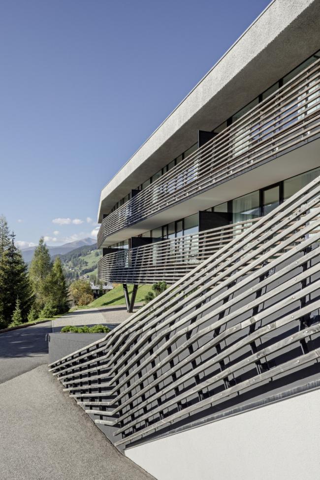 Strata 和 Paramount Alma 的策略不断跟进:从陡峭的地形开始,落叶松木条屏障缓缓揭开了建筑的体量,形成覆盖的外部空间,其中部分屏障被引入到内部,然后变成通道和停车场的天花板,创造出一个主题连贯且有氛围的空间。在这个空间可以看到周围的山景。粗糙的喷塑灰泥、大的落地窗和有微微棱角的木条则决定了外观形式。