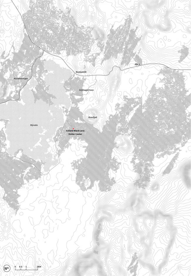 竞赛设计场地位于冰岛北部地区;这是一个偏远的场地,它位于 Hverfjall 火山和 Mývatn 湖之间,Hverfjall 火山和 Mývatn 湖这两个地方本身都是受欢迎的旅游景点。游客中心特殊的地理位置,为流连于这两个旅游胜地的人们提供了歇脚之处。