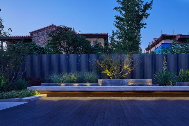 地面也均为混凝土整体浇筑,整个排水系统通过中间的木平台来解决。当夜幕降临,灯光柔和,清风徐徐,砾石、混凝土、木材烘托着植物,营造着轻松怡人的花园环境。