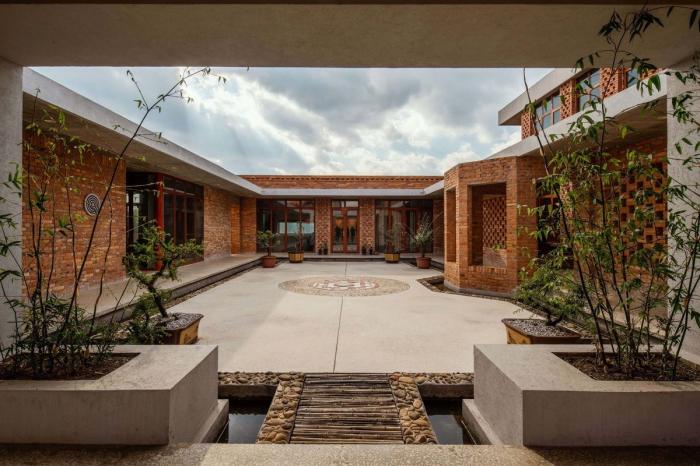 合院地面景观采用曼陀罗图案作为概念,中央以红砖砌筑坛城作为主尊,四周一圈溪水作为外道,用鹅卵石镶边,内置部分石块以求自然溪流的野景景象。