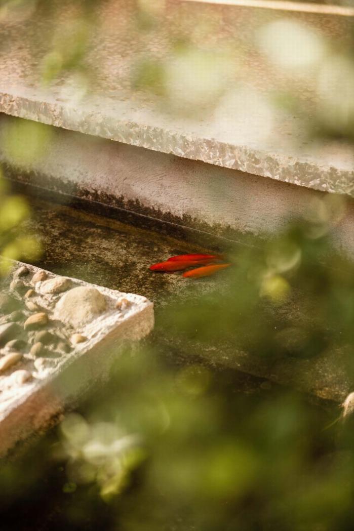 四周游廊地面向水溪一侧出挑薄板,隐藏视觉边界,溪水在合院四角放大成方池,睡莲静卧,给庭院增添一丝淡泊。