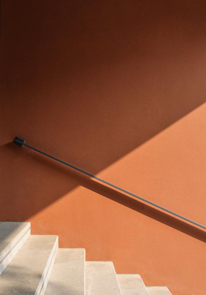 建筑主色调为灰色,在寝室阳台与入口处点缀了橘红色墙面,为建筑增添了一份暖意与活力。并与校园内红砖建筑有了群体建筑间的呼应。