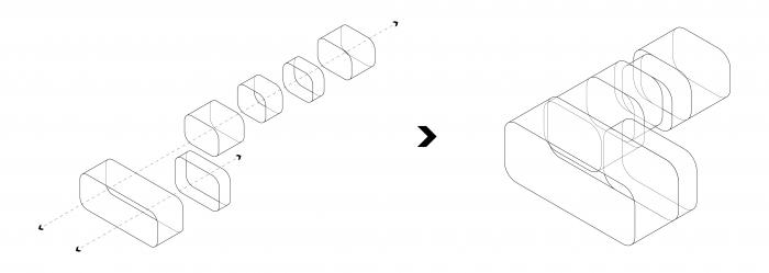 ▲ 弧角造型的功能单元模块,嵌套组合形成基本空间体系