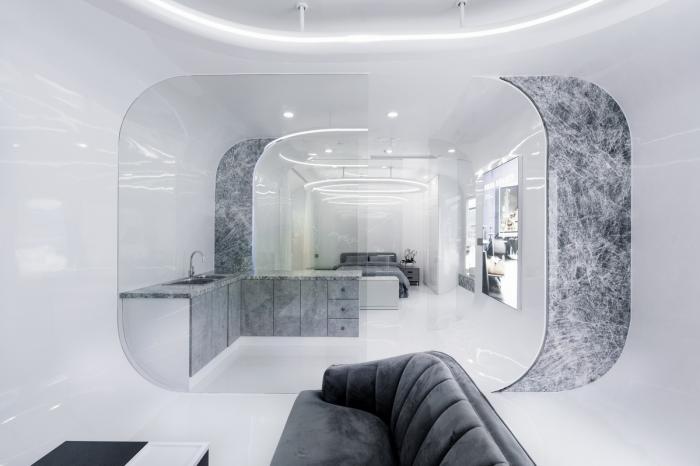 从模块空间的界面形状到展台的边缘、信息墙的形状、灯具的造型,整体均贯彻处理成为弧线,柔化科技的距离感和冰冷感,使智能家居的呈现更加亲切自然。为强调曲线造型,在边缘交界处的墙面使用大理石贴面,石纹质感强调家居属性,为空间添加了重色,丰富了层次感,也使纯白色的空间环境不至于过度冷漠。