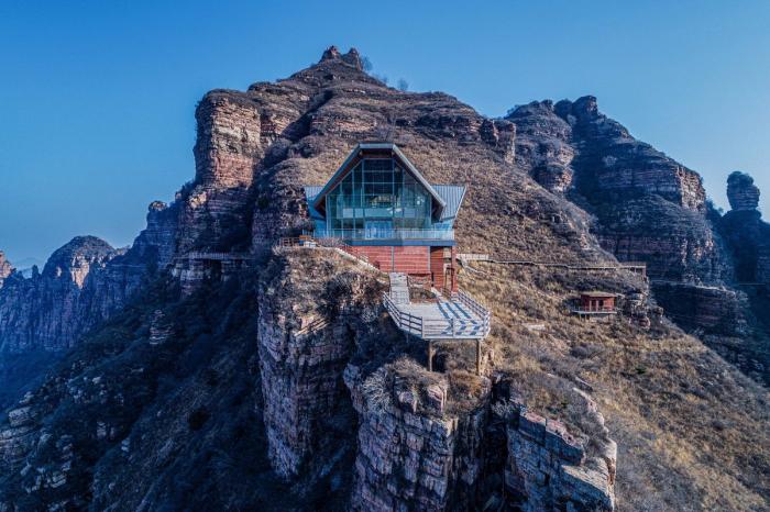 项目位于华北平原和黄土高原的边界——太行山脉东部的东太行景区,依托当地独特壮观的红砂岩山脉景观。景区特色在于几乎全部路线均为悬崖高处的空中栈道,在此高度上穿行于奇峰怪石之间,是一种全新的视觉体验。