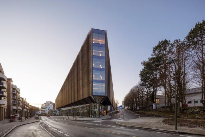 Bjergsted金融园区是位于斯塔万格中心的SR银行新总部。中央金融园区和文化场所的新地址加强了该银行在该地区的独特地位。在这里,公司可以实现其在当地创造价值的愿景,并为周围的环境和建筑物的用户提供最好的服务。该项目为未来办公场所创造了先例,也是欧洲最大的木材办公建筑之一。使用木材建造大规模的银行是对“银行”这一概念的挑战,同时为木结构建筑开辟了新的道路。13200平方米的地面主体结构由高达七层的木材建造而成,它坐落在9000平方米的地下结构之上。