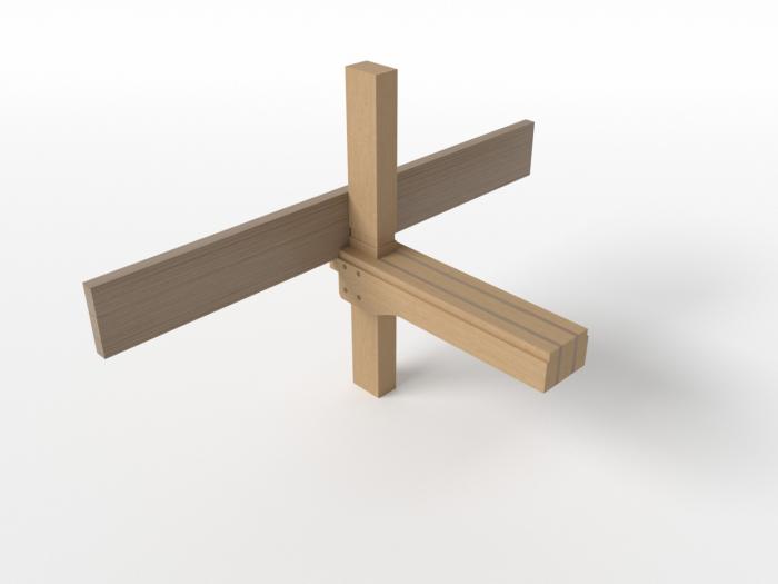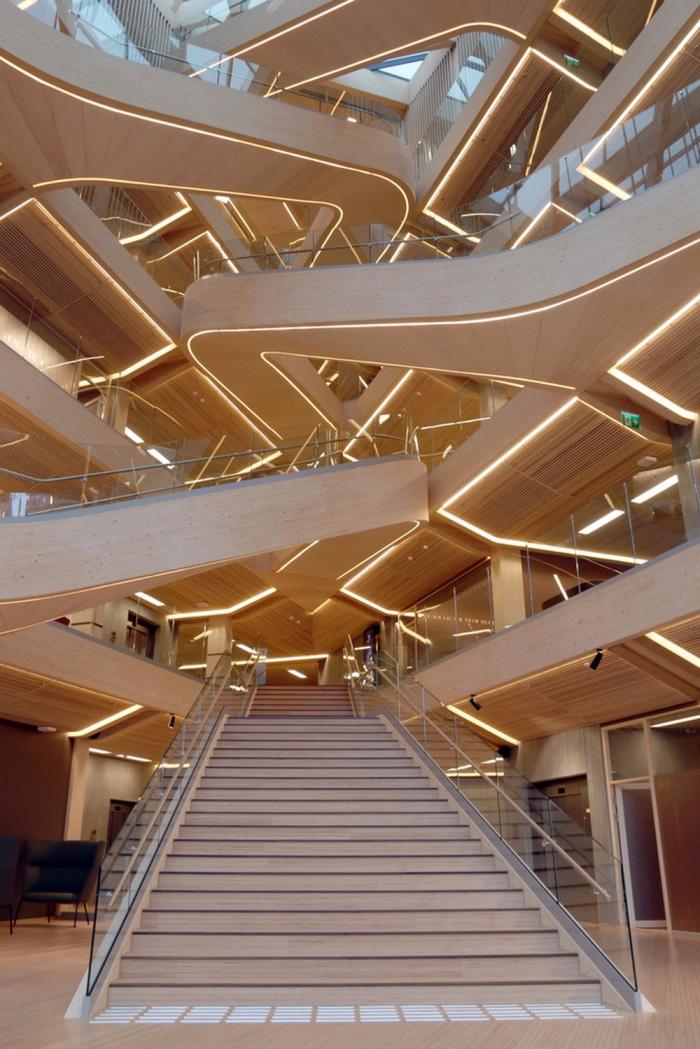 该建筑的特点之一是带有榉木榫钉和有机成型木梁的木材接头。木结构由四个楼梯轴,沿着每一层立面和CLT楼板的层压榉木贴面中的连续边梁来加固。底层立柱和横梁由于悬挑于人行道上方而采用层压山毛榉制成。结构的其余部分是由云杉胶合和交叉层压木材制成的。承重楼梯纵梁在两个方向弯曲,为悬挑至中庭五米处的壮观开放式楼梯提供支撑。结构元素中使用的各种木材都具有相似的美感,它们交织在一起创造了木材整体的有机体验。