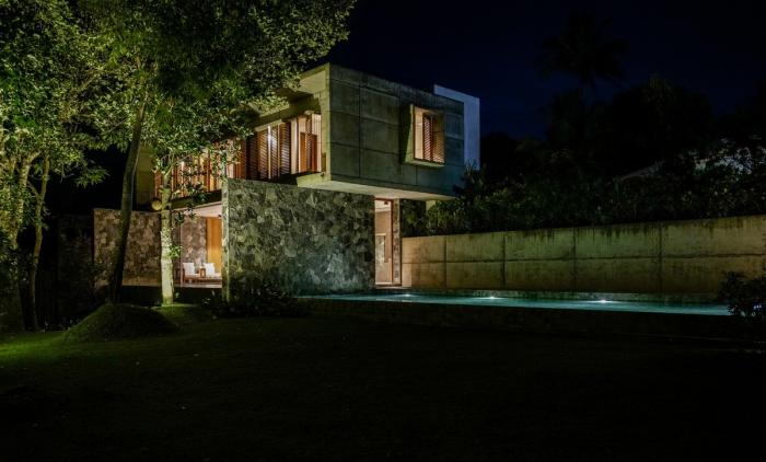 场地的主要部分是河畔保留的土地,房子被建在闲置的可建土地上,并呼应河流景观。通过体块形式、开口和细节的处理,自然和当地材料的运用和补充,房子适应了当地的热带气候环境。房屋并非建在支撑物上,而是落于地面,与坡地融为一体。通过保留墙体,确保最少的土地开挖,融入自然的轮廓而非与之对抗。