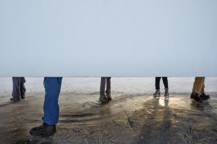 一只巨大的白盒子悬停于冰面之上;在盒子里,有人在走动,等待打发时间,或者仿佛悬于地面上。发生了什么?
