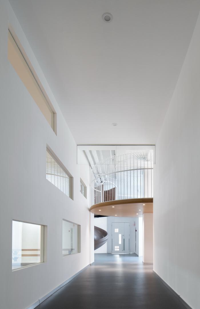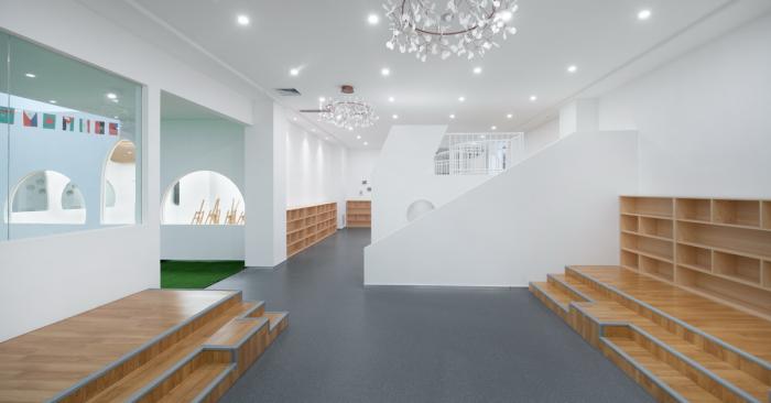 摒弃以往幼儿园中常见的斑斓彩色,以白色为主基调,少许绿植作点缀,隐隐透着春天的气息里,干净而纯粹的空间给予视野无限的放空与遐想。