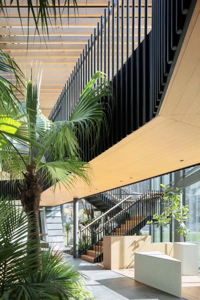 一共有8个高低错落角度不同的塔,一层2个塔内是泡池,其他塔内是服务空间,二层8个塔内分别是2个Spa,5个泡池和1个休息区,塔外是玻璃盒子包裹的大开敞植物景观区域。8个塔在一楼以游园步道连接,在二楼以空中连廊连接,都是闭合的环线没有尽头,有很多种可以自由选择的动线,人们就像是走在森林里一样。沿着动线,散布着咖啡,休息,化妆,商店这样的一些小功能空间,让行走的体验更加丰富。