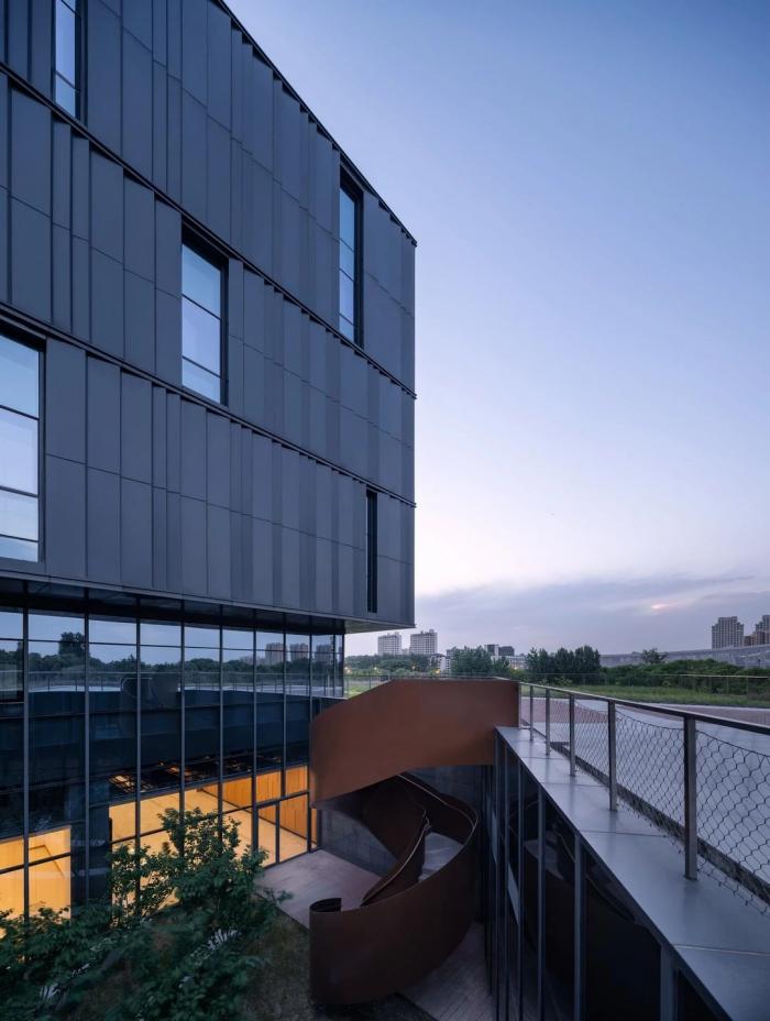 办公用房位于北侧,可以享受优越的沿河景观。其中二层会议空间可达首层屋面延伸形成的观景平台,南向及东向背水面 、库房位于东南侧,隔绝了沪青平公路的噪音。