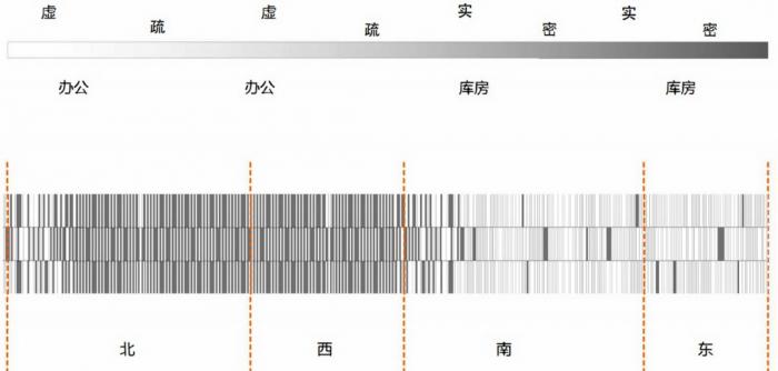 库房区域为竖向肌理的毛面石材表皮,点缀竖向灯带,办公区域为落地窗外包竖向石材百叶,并在相交处做过渡处理, 保持整体完整性,同时又对应了各自的功能。办公用房为落地窗,外挂石材百叶,与库房封闭空间的石材表皮形成统一的表皮肌理的同时,满足不同功能的使用需求 。