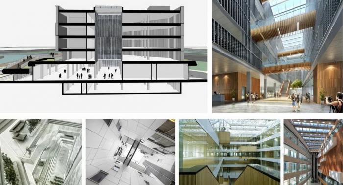 通过功能的复合叠加,对档案馆进行紧凑集约设计,同时仍然注重内部空间的趣味性与体验感。在建筑内部打造狭长型的通高中庭——光阴之庭 。不仅解决了大进深建筑的采光问题,同时也能改善室内微气候。