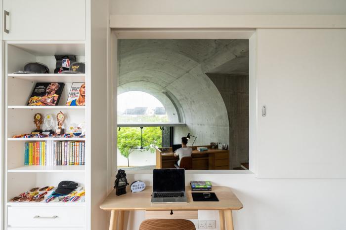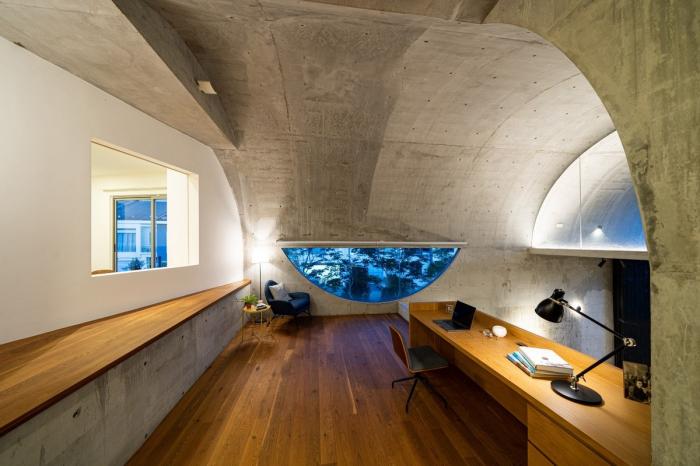 为了平衡混凝土拱券的重量感,设计师针对二层的开口进行了精心的构思和设计——比如拱顶侧面的拱窗在与正前方拱形开口交接时变成了连续的“S”形。由此推之,在整个二层,每当开口与拱券的线条相接时,这种连续性都有所体现,随之带来的节奏感更是为看似沉重的结构内部带来了细腻的光影变化。这一场景不禁令人想象自己正穿过一条幽深的隧道,并在尽头望见了满目阳光。